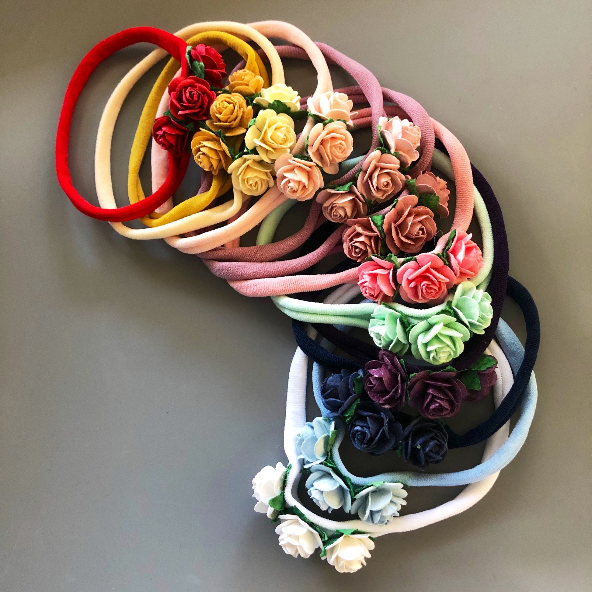 2 Handmade flower headbands created using paper flowers