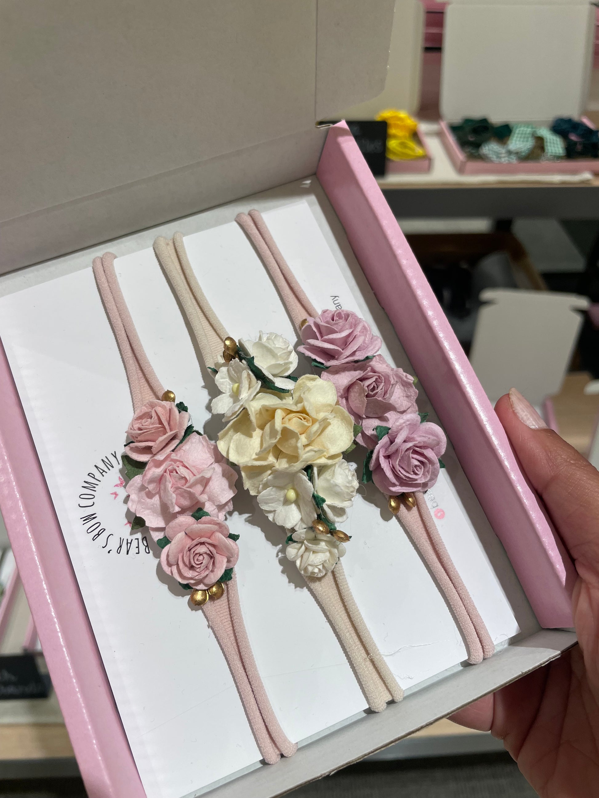 3 handmade flower headbands (pink, cream and lilac with gold detail)