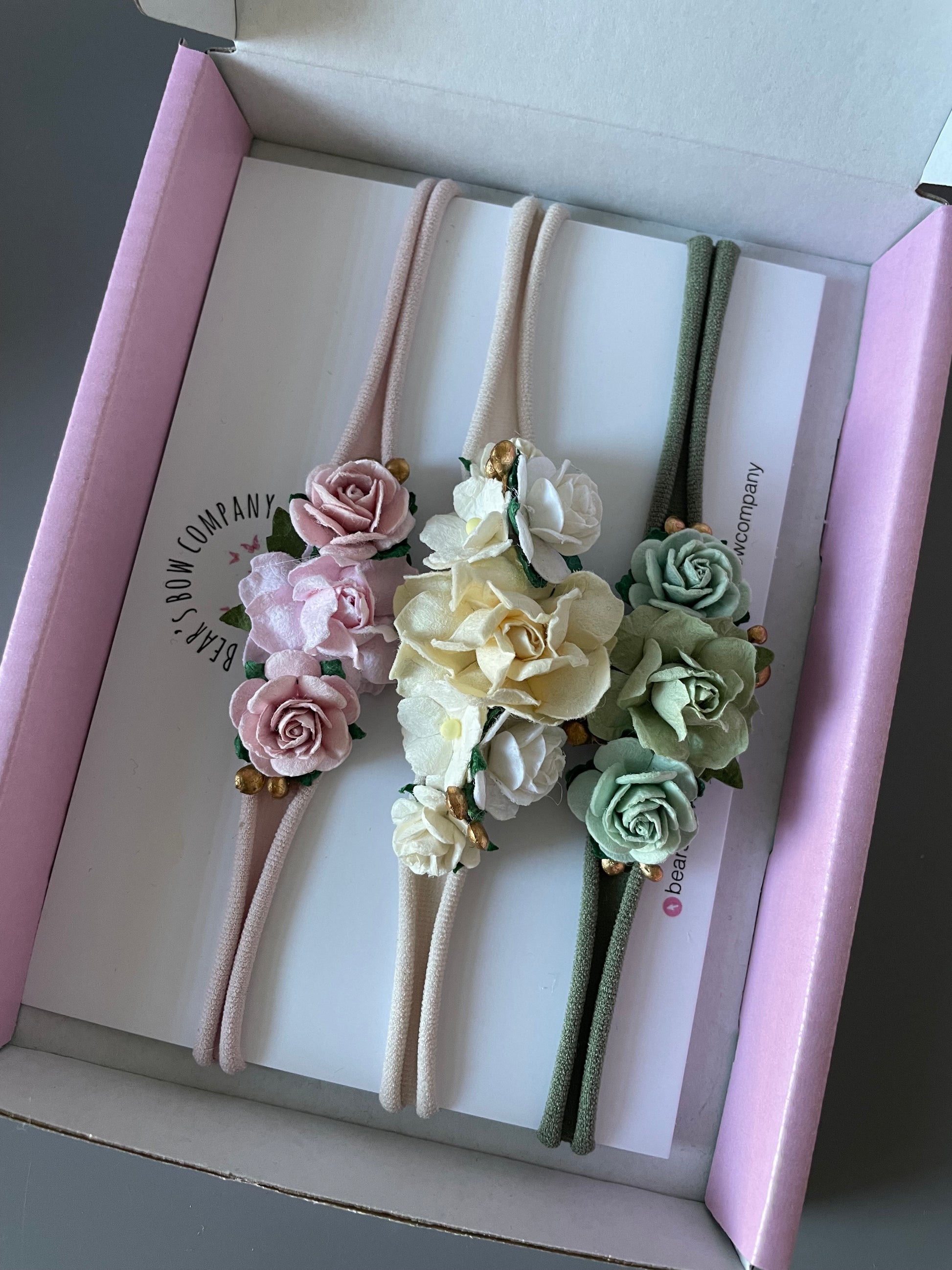 3 handmade flower headbands (pink, cream and sage with gold detail)