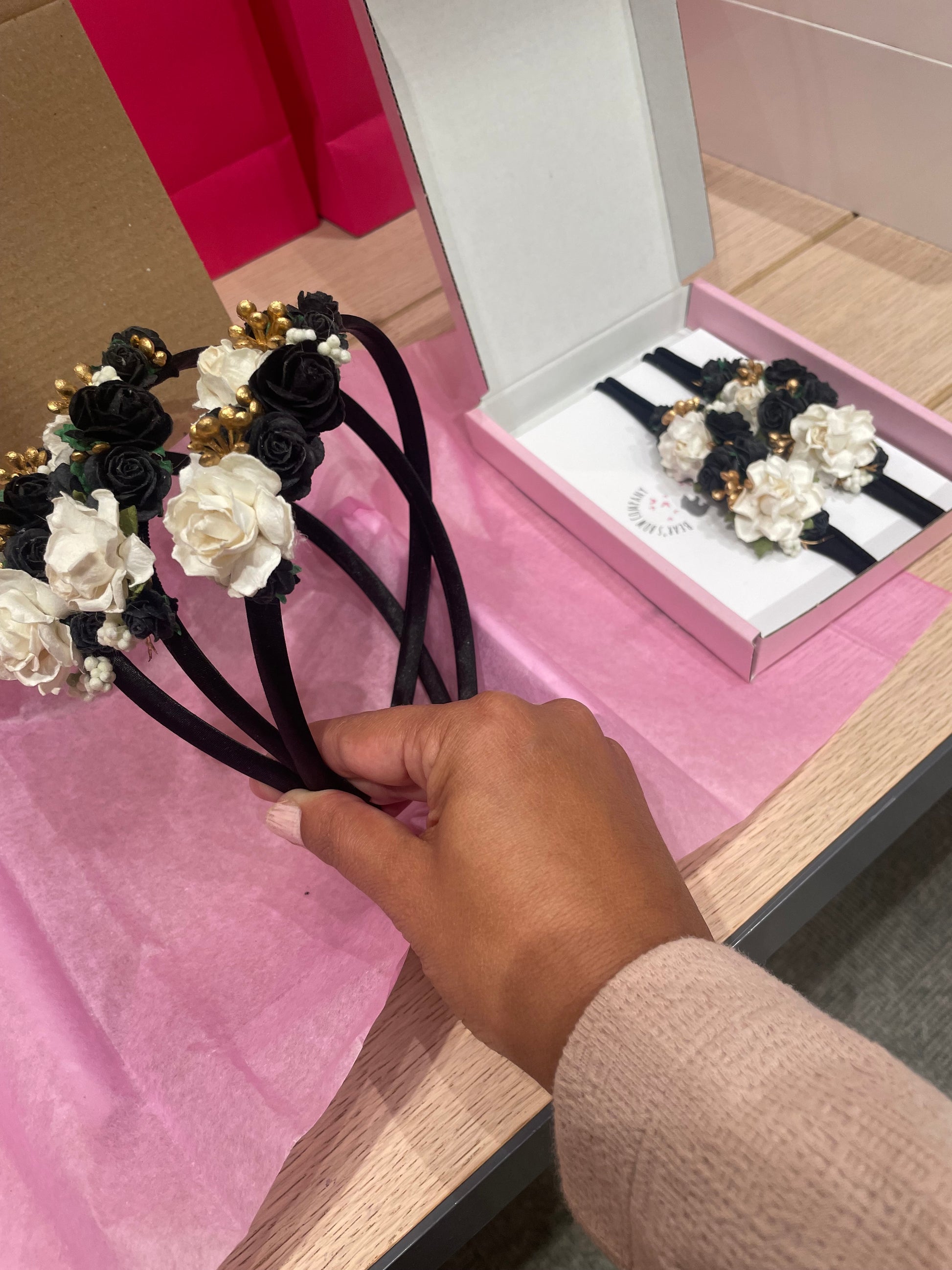 The mulberry flowers have been carefully mounted on to a matching nylon headband.