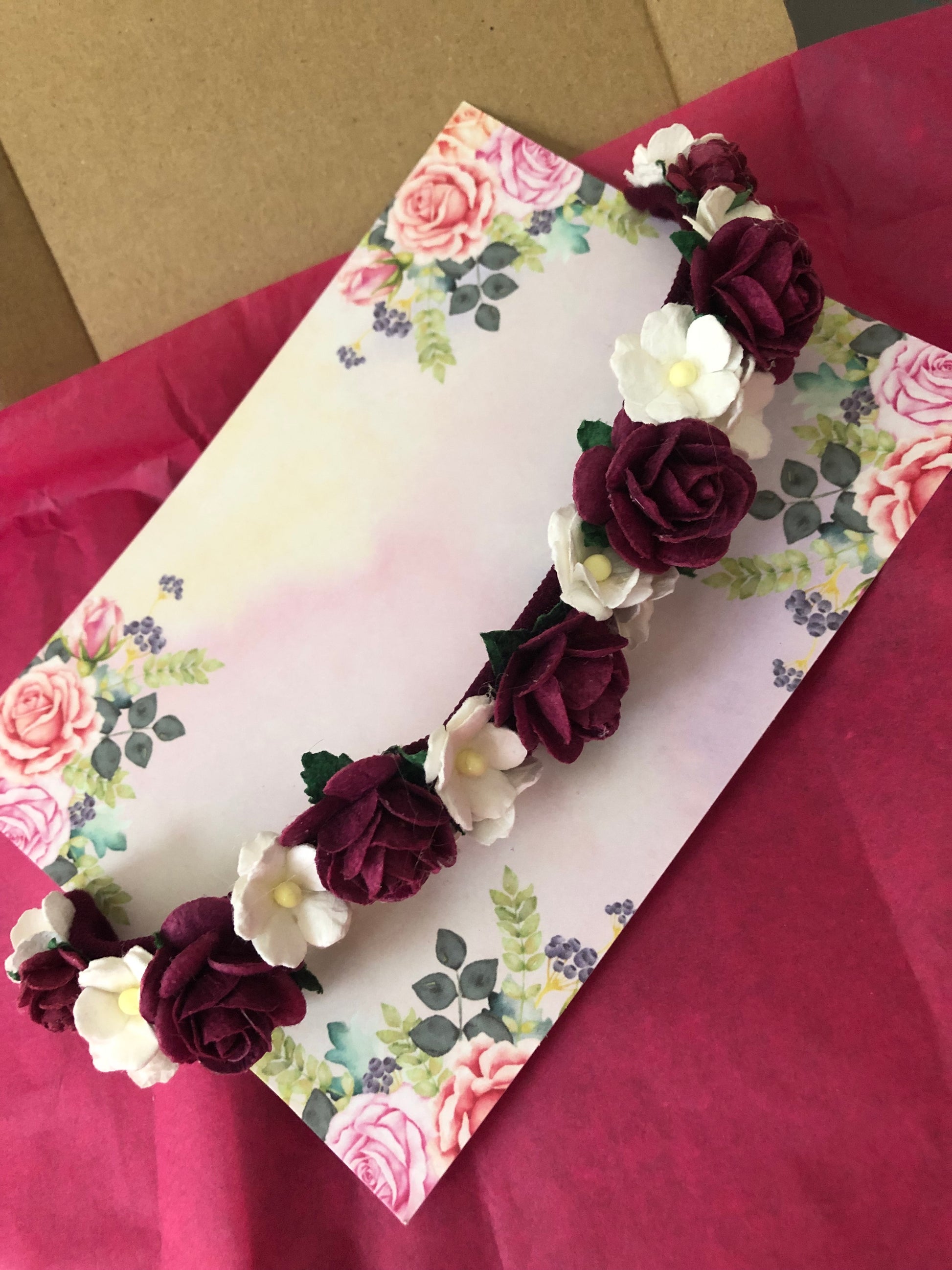 The mulberry flowers have been carefully mounted on to a matching burgundy nylon headband.