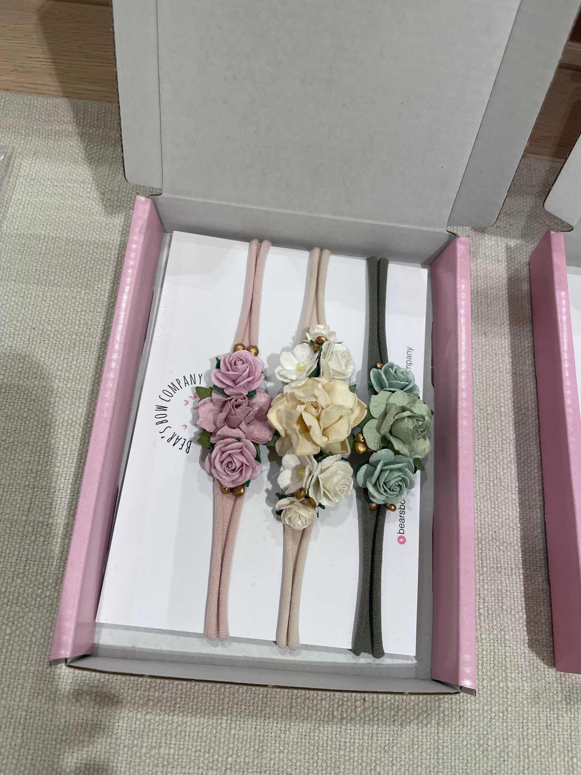 3 handmade flower headbands (lilac, cream and sage with gold detail)