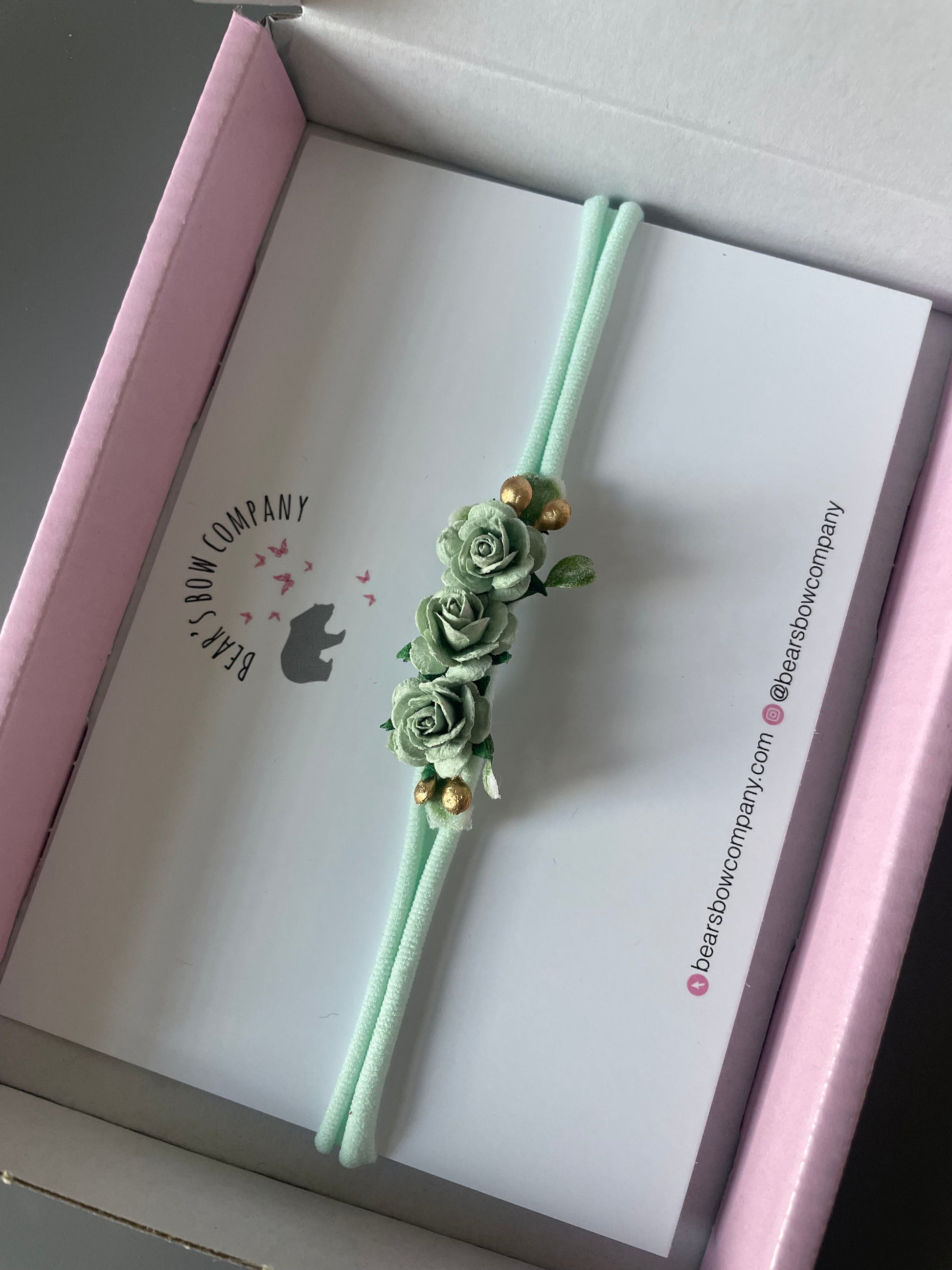 Sage Green Flower Headband with gold detail ideal for newborns and toddlers
