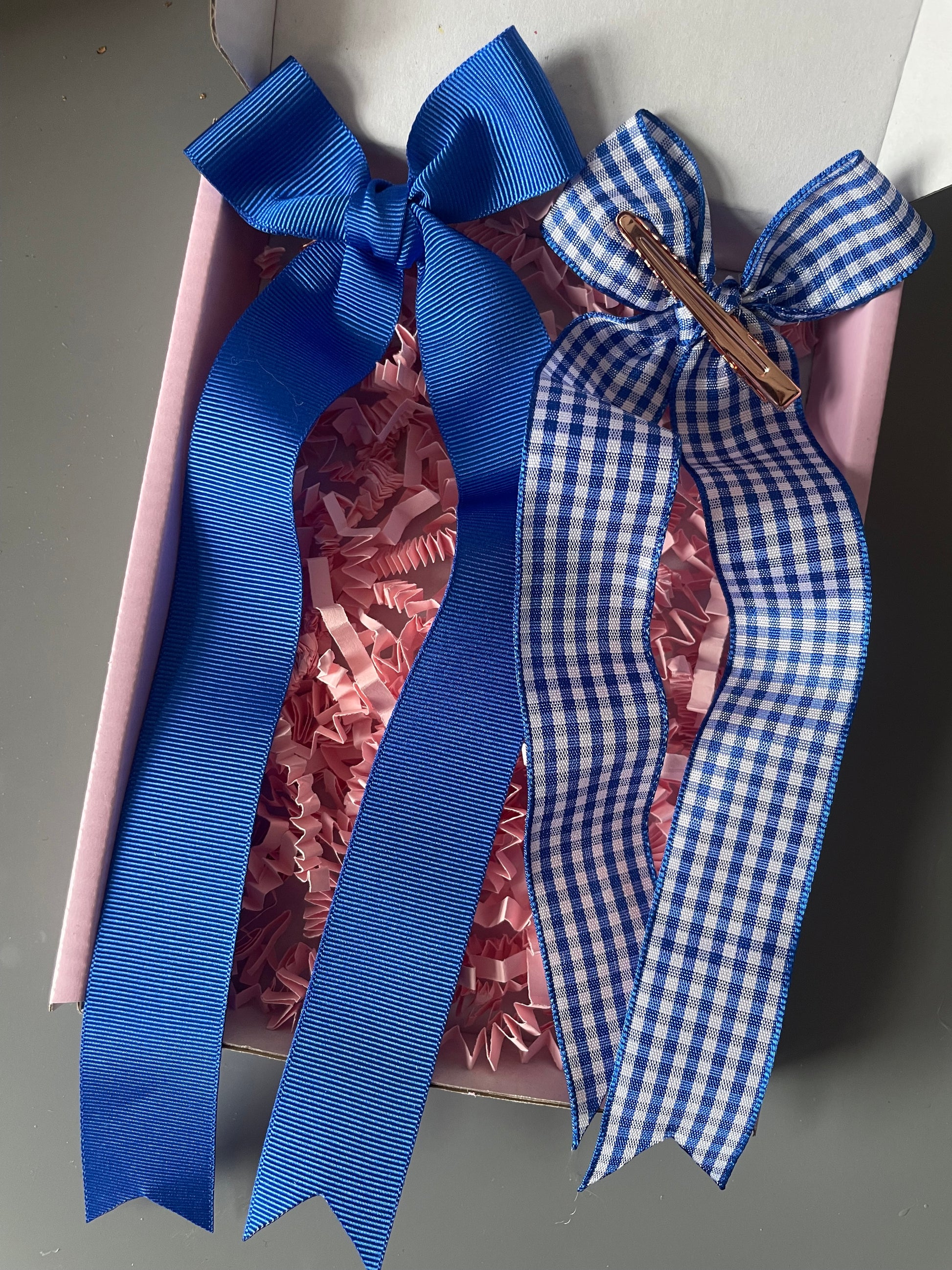 2 Royal Blue Long Tail Bows (grosgrain and gingham)